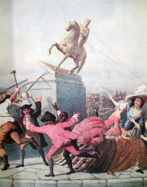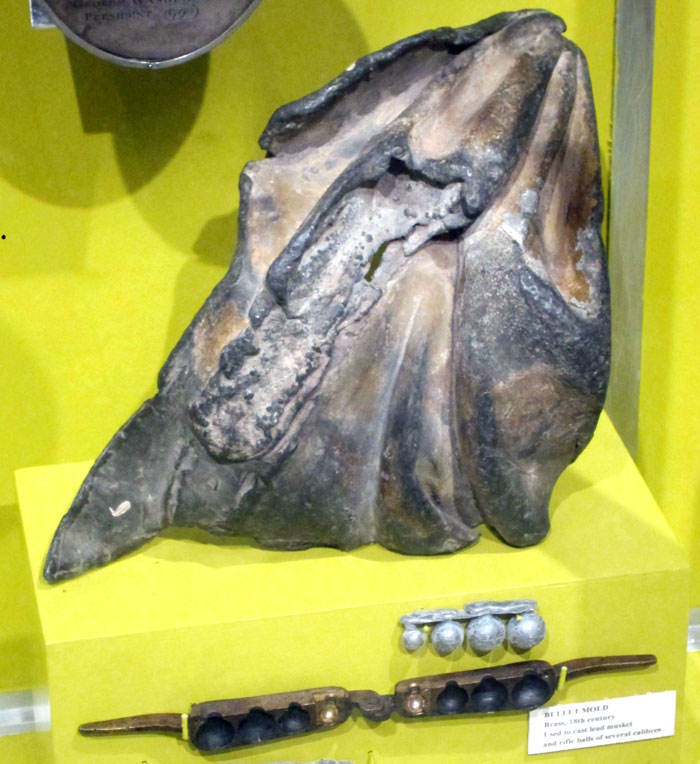 that’s right. I won the Hartford Courant (newspaper) essay contest about 1960 (can give you exact date when I pull my file at home). In 7th grade I started working in the the Wilton, Connecticut, Public Library (starting to see the connections and threads in my life?). I do not remember names usually, but John Davenport, who worked there, told me about King George III’s Statue in New York City, and showed me a piece of the statue he had. A small piece, and the most highly gilted piece ever found. When the Declaration of Independence was first read in New York City, July 9, 1776, the lead statue of King George III on Bowling Green was torn down. Loaded onto wagons to be hauled to the military depot in Litchfield, Connecticut (I lived just south of there with Cathy), the lead was going to be melted down into bullets to be hurled back at the British. On the wagons’ trek, however, Loyalists stole pieces of lead burying them. This happened in my hometown of Wilton, Connecticut, when the wagons were parked at a tavern – the Sloane house. Over the years pieces have been found, and this large piece was given to the state in 1960. The piece in the museum – a shoulder piece of the toga on the King.