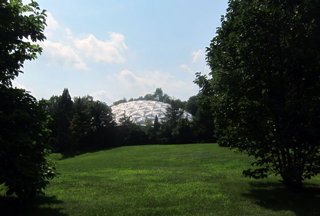 Next on my list for the day – and tying into my recent week program at Historic Deerfield that I still need to share – was Dinosaur State Park in Rocky Hill, Connecticut. The dome you see below covers the tracks on exhibit, and under the field in front are more that were recovered.