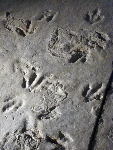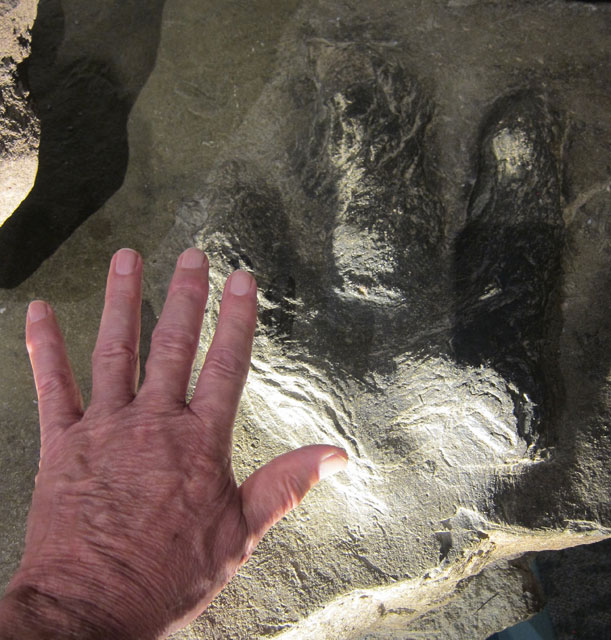 As you begin to learn about these preserved tracks (more in my overdue post) you will learn that they are found in sedimentary rocks, and layers will separate. There will be a positive (the original print) and then new sediments fill-in, and you get a negative impression – as above. But how can that happen? I learned on one panel. Fine flakes of Mica are in the sediment, and act as a lubricant to hold the sediment shape. The more Mica, the better a shape in sand is preserved, and later the easier each layer can be separated into the positive (actual track) and negative stones.