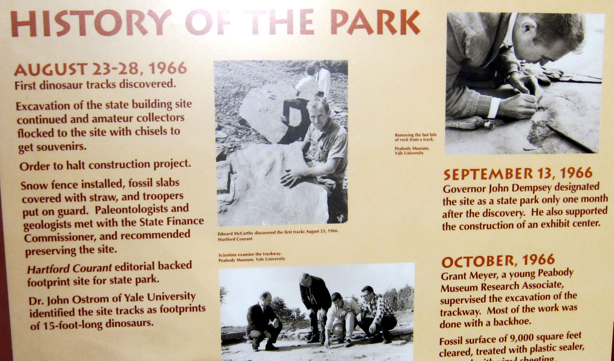 Just off I-91 south of Hartford a few minutes, you have to stop. The stretch of road has state government offices and facilities. The dinosaur tracks were found when another excavation began. Within days after discovery, the site was preserved.