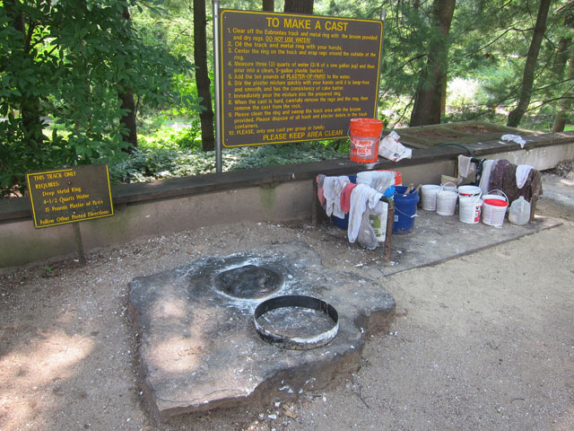 Outside, before the nature walks, is a group of negative stones (raised impression) where you can make your own plaster cast of an actual dinosaur foot print. A great activity to join in.