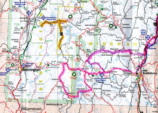 I had never been on the section of Route 8 from the point Route 100 heads south. You think of Route 100 as a truly north/south route – the back bone and spine of Vermont – but note the circuitous route below Route 9. I now, looking at the map, realize why – the reservoir impacted a more direct route.