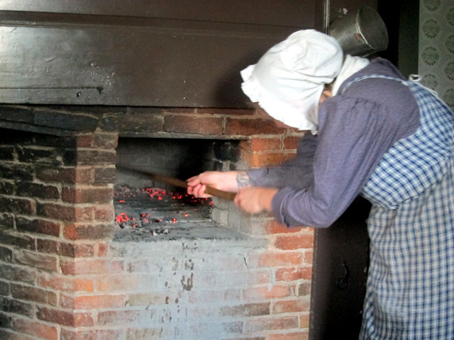 With the fire in the oven bringing the bricks up to temperature, Ruth scraped out the coals. Then, with her experience, she checked to see if the temperature was correct. It was, she could only hold her hand in the oven for 12 seconds.