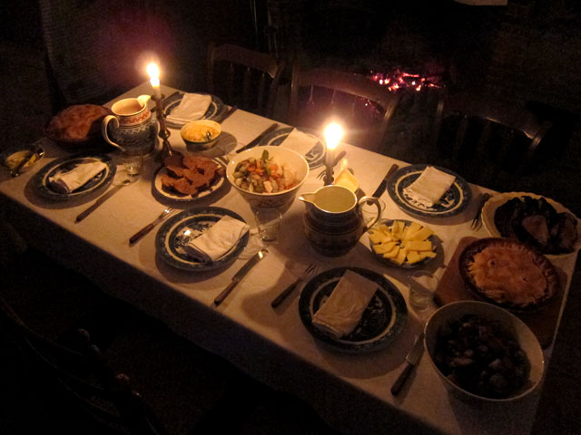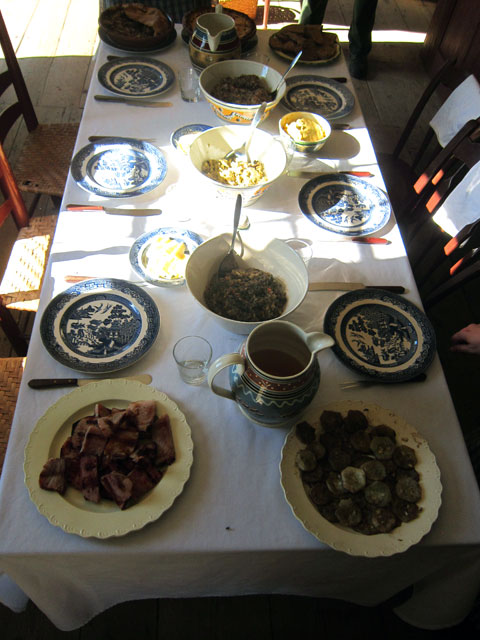 As an appetizer, Laura prepared Pounded Cheese with Common Crackers. She grated two cheeses, and then rubbed together with butter using a mortar. Sherry was added for that extra touch (I have all the recipes for the event, just email and ask).