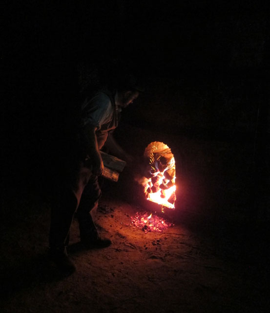 Sometimes (as is my good fortune) timing is everything. Once a year the potter’s kiln at OSV is fired, and this was the night. A three day process to fire several thousand pieces – and we were there at the right night. The fire burns at two opposing sides – not the inside of the kiln. The intent is to bring the kiln to 1800 degrees if I remember correctly. The coals are cleaned out below the burning wood so the draft of air carries the heat up into the kiln.