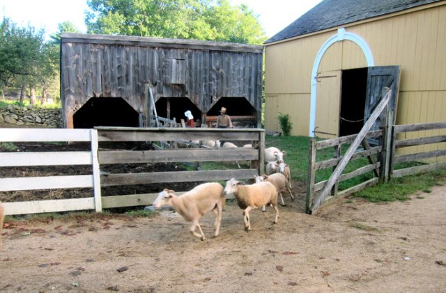 And then it was into town to feed chickens, turkeys (Thanksgiving is coming – don’t tell them), and the sheep. The sheep stay at the Towne House residence at night, and at the other end of the common (next to the Meeting House) during the day. Twice a day a gate is opened, and off they go for their next feeding.