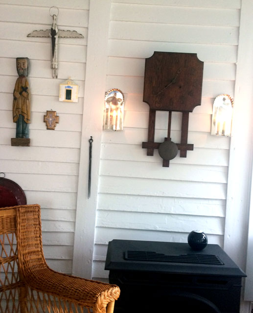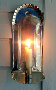 Remember my post – FLICKERING HOMES OF A HOPELESS ROMANTIC? Well, now I have two more candles on my porch – my own handmade tin sconces that I made at the OSV Tin Shop. Not a good image below – better in flickering light – on the board in the center is my gift of two blacksmith made skewers.
