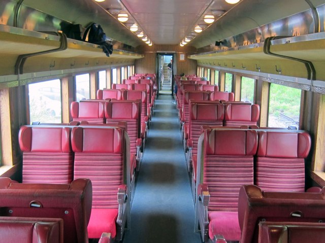 We “general passengers” were shown to these beautiful Budd cars, while the bus groups were in some older style coaches. Quickly seeing my options, I staked out this comfortable spot in the bar/food service car. I had two chairs and a table to myself – special for a sold out train.