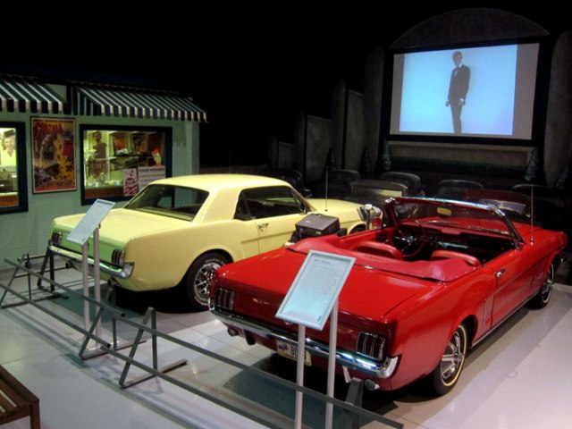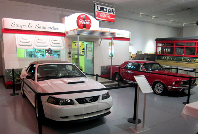 and, a drive-in theater and refreshment stand. The exhibits at the museum rotate, and the temporary exhibit of Mustangs were departing. At the drive-in were these two classic Mustangs. In my “Mustang” days (late 1980s, early 1990s) I owned a 1965 Hardtop (Maroon) and a 1966 Convertible (Royal Blue). I know all the trouble spots in these models.