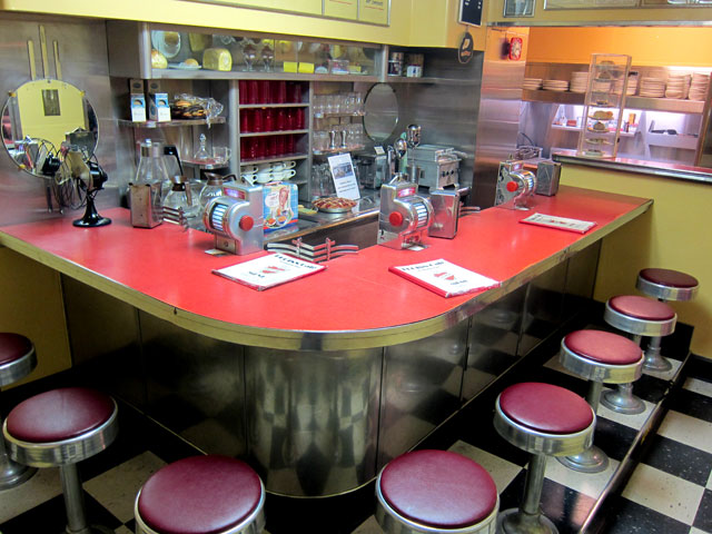 When I was on the TV show “Giant Step” with Bert Parks (in 1957 opposite the Walt Disney’s Disneyland, so you probably missed me), I told him I wanted to own a diner when I grew up. I have been fascinated and collected diner items since (what else?). But I had never seen this small style diner – Flo Fortnoy’s restored 1941 Valentine Diner. Next to the door is a money slot where the owner would drop his/her payments for the diner to be collected by the Valentine Diner Company.