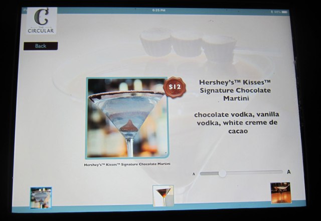 I was first given an iPad to view the drink and wine selections. Was there a choice? Yes – I selected – Hershey’s® KissesTM Signature Chocolate Martini with Smirnoff vanilla vodka, 360 chocolate vodka, and white crème de cacao. The gallery below shows you my table and its accoutrements.