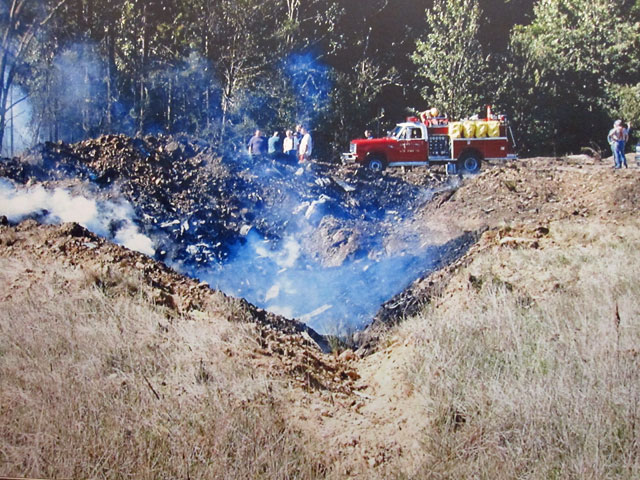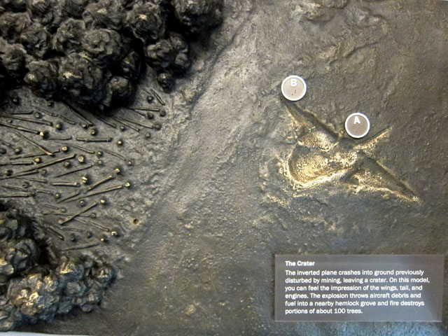 the end of the ramp overlooking the site. This area was originally an open-strip mine, abandoned and covered over at the time. Two people working in the area saw the plane in its last few seconds – apparently upside down – and traveling at over 500 MPH. A few more seconds of flight, and the plane would have landed in the local School.