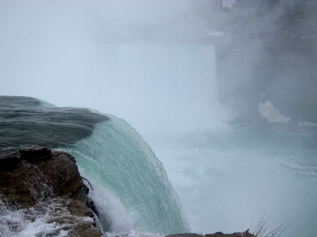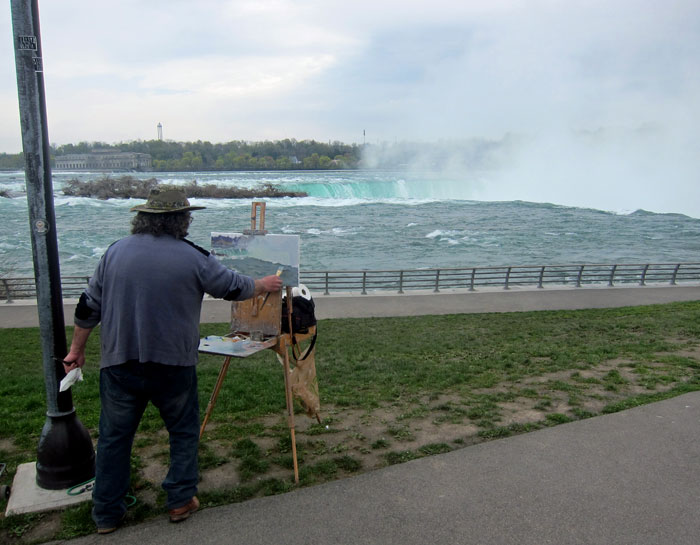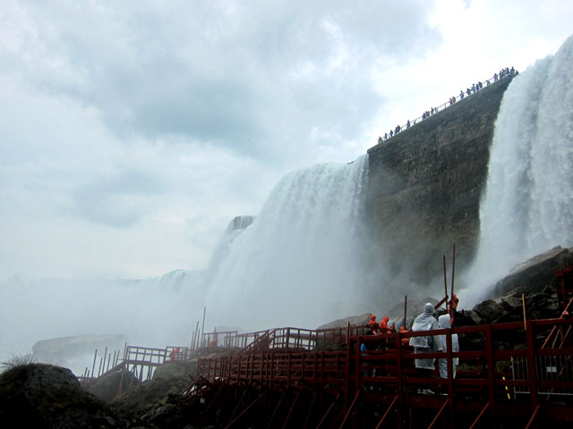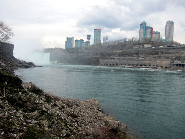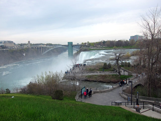 I then headed south along the river through depressed Niagara Falls, New York, to Niagara Falls State Park to experience the American side of the river. Still early in the year, but plenty of visitors. Construction workers were still rebuilding walkways damaged over the winter by ice, but the elevator was operating through solid rock taking you down to the Cave of the Winds (no longer accessible) under Bridal Falls (on the right) with the view of the American Falls.
