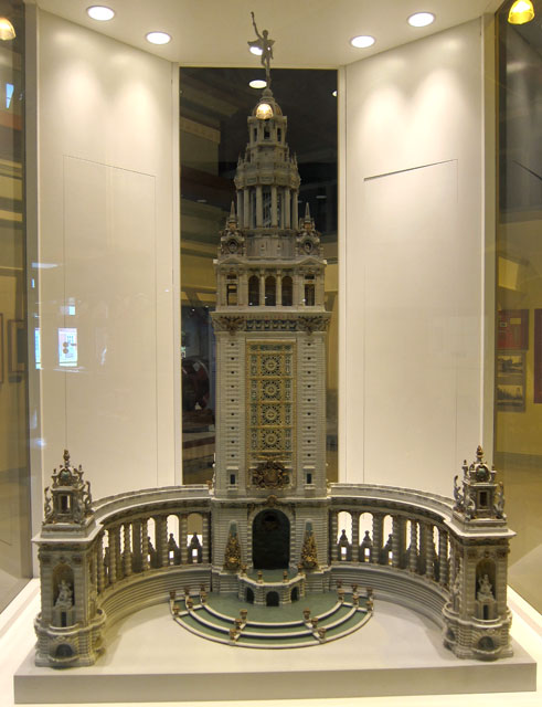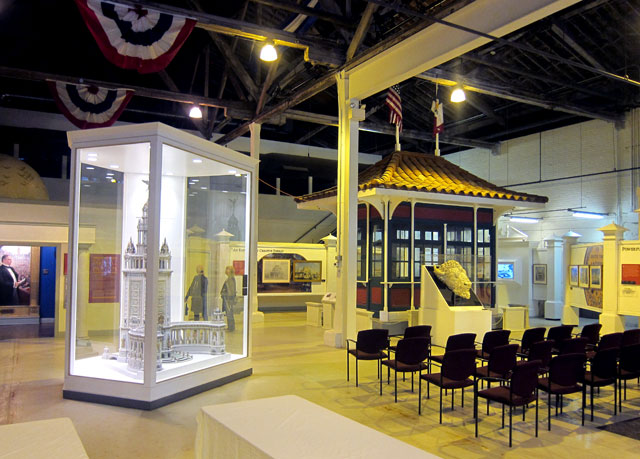 In this view of the center of exhibit hall is the model of the Electric Tower and the “little building” that was saved from the fair, and had an interesting life before finding its way here.