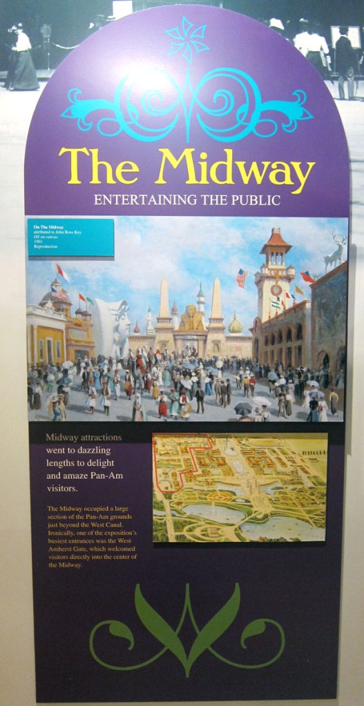 American Exposition, and our collection storage areas populate the Resource Center. In the 1990s, The Buffalo History Museum acquired and renovated the streetcar repair barn (circa 1895). The materials housed in the Pan-Am Building during the Centennial, transforms this 100+ year old trolley barn into a Pan-Am Exposition hall. The combined exhibit features “the Little Building,” a rediscovered structure from the Pan-Am grounds, plus artifacts and hands-on displays that explore the exposition’s funny and serious sides.” And, for history, here is a C-Span program. This exhibit was created for the 100th anniversary of the fair. Below are some highlights. In my opinion, the presentations at the fair, and the untimely inauguration of TR defined the 20th century as it dawned, and transitioned from 19th century institutions.