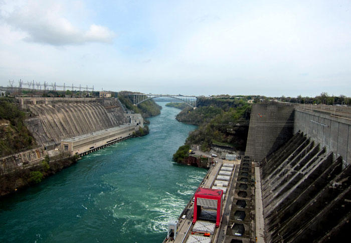 Here is a view from the visitor center walkway looking north. This point is twice the height of Niagara Falls. The Canadian generation plant is on the left.