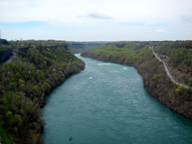 Powerlines are underground to preserve the park like setting. The visitor center is amazing with history of the area, the construction, video, 4-D experience (that is not a typo), and many educational hands-on exhibits to learn about electricity. Worth a visit, and additional research. The view below is looking south on the Niagara River back to Niagara Falls, New York. On my trip 5 years ago I travelled down the road you see on the right – the Canadian side.