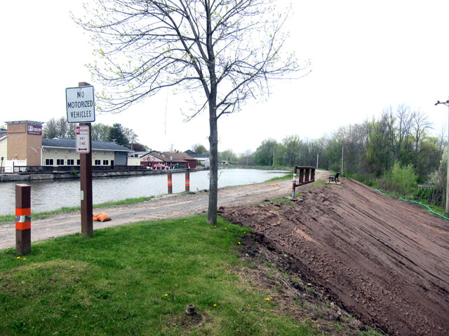 The roughly 60 miles from Lockport (at the Niagara Escarpment) east to Rochester is basically flat with no locks. But bridges are required for traffic to cross the canals. Where long approaches are not possible to have a bridge high enough for boats to go under, lift bridges were installed, and the entire bridge is raised at once with counterweights – fascinating. And, as you can see below, as I turned around for this image, often the canal in not dug down, but built up.