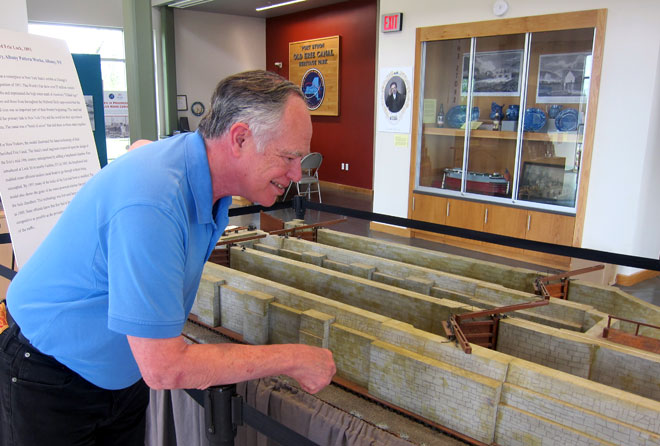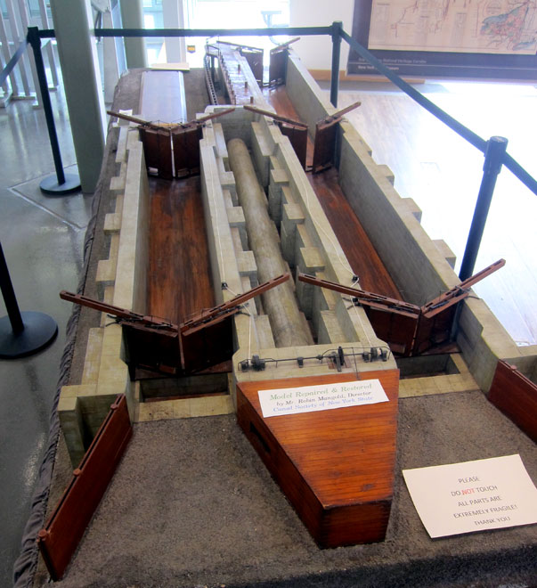 Many displays are in the visitor center, including this model of a double lock with the overflow tunnel shown between the locks. Note the wooden abutments before the stonework and the spaces allowing for the overflow to enter the tunnel – I clearly saw the overflow holes in old Lock 59. This model was exhibited at the 1893 Columbian Exposition in Chicago, then the New York State Museum. It ended up at the Canal Museum in Syracuse, but was relegated to the basement where it was rescued by the society and restored for exhibit here.