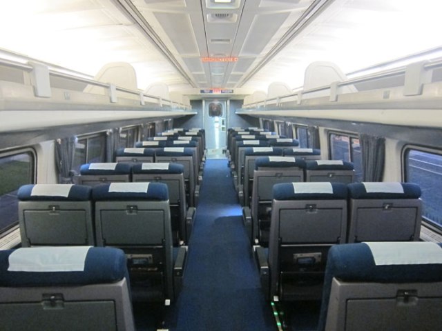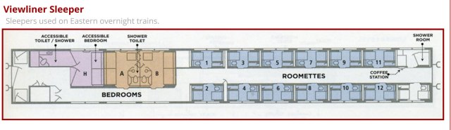 On the east coast, single level Viewliner cars are the norm (you can click on the car diagrams for larger views). The Sleeper Cars have this layout. I was in a Roomette – bunks for two (best for one), and a hidden sink and toilet. You can find videos on YouTube touring the sleeper options on Amtrak.