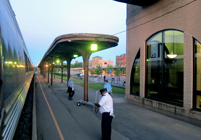 see those ghost reflections from the lights on the walls of the car? Coming into Utica an announcement came, “anyone with medical experience please come up front.” I learned someone had a seizure, an ambulance was called, the passenger taken off, and our stay at Utica’s grand restored Union Station was 25 minutes longer than planned.