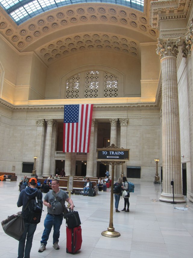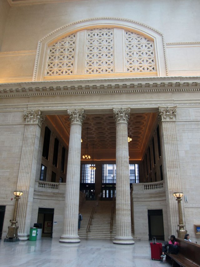 Chicago’s Union Station, particularly the grand hall is impressive, and you may recognize this stairway.