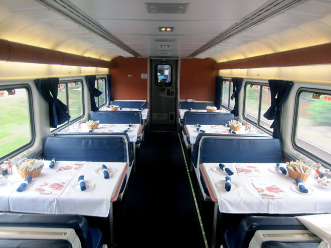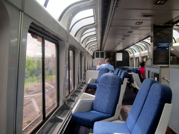 The train pulled out promptly at 2PM, on schedule, and I was off to explore. I headed out to see the dining car and the observation sightseeing car with its cafe and additional seating area on the first level.
