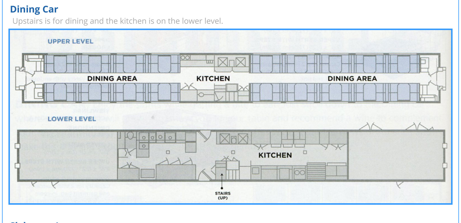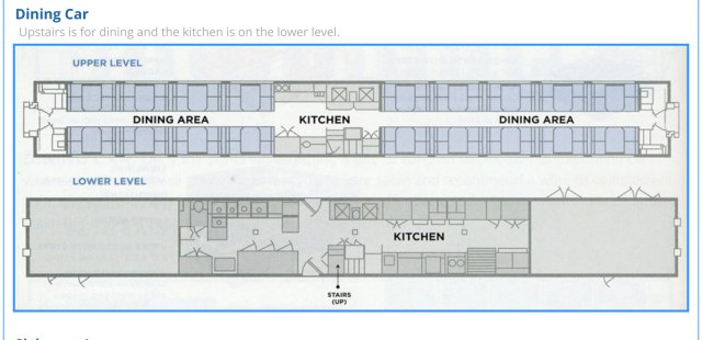 In the center of the second level of the dining car is the serving prep area, and seating both “fore and aft.” The kitchen area itself is on the first level, and the food comes up on a dumbwaiter.