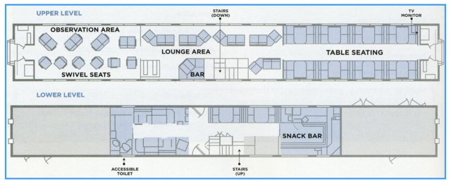 The observation/sightseeing lounge car has a cash cafe which is used mostly by coach passengers. I never perused the offerings, but from the attendant’s announcements, believe the fare to be of the gas station convenience store variety. Below is the layout of this car.