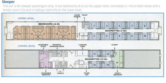 The Amtrak Superliner trains in the west are double deckers, unlike the eastern single level Viewliners. You pass from car to car on the second level. The lower levels are various uses as you see in the diagrams below.