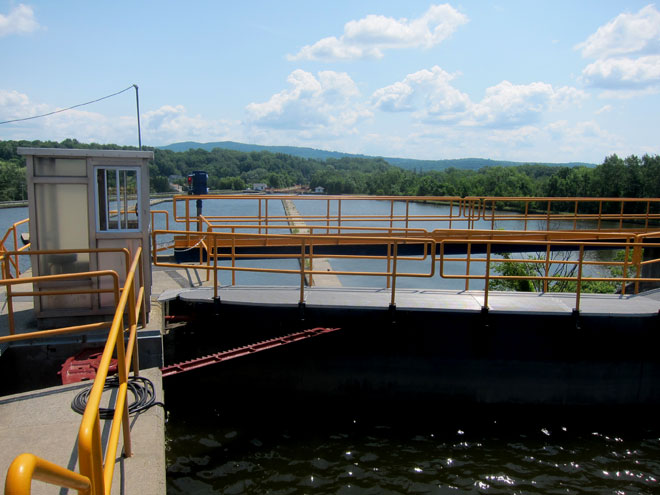 Locks 2 and 3 above are the beginning of the Waterford Flight of Locks 2 through 6 of the 1918 Barge Canal. These five locks have a lift of 169 feet in just over 1.5 miles. Until recently these locks were the highest lift in the shortest span in the world. The five lock’s lifts range from 32.5 to 34.5 feet, and accomplish what the 18 original locks accomplished in Cohoes, and 16 pairs of double locks with the enlarged canal in the 1860s. Here is Lock 4 looking back to Waterford