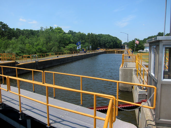 Both the Champlain and Erie Canals begin in the Hudson River. In fact, Lock 1 of the Erie is in the Hudson. The Barge Canal begins in Waterford with Lock 2 at a lovely facility. Below is from that dock looking at Lock 2.