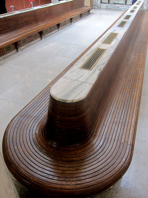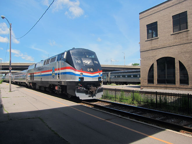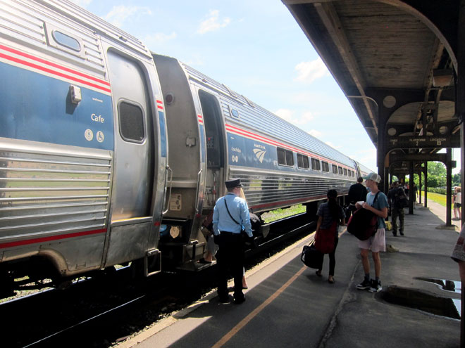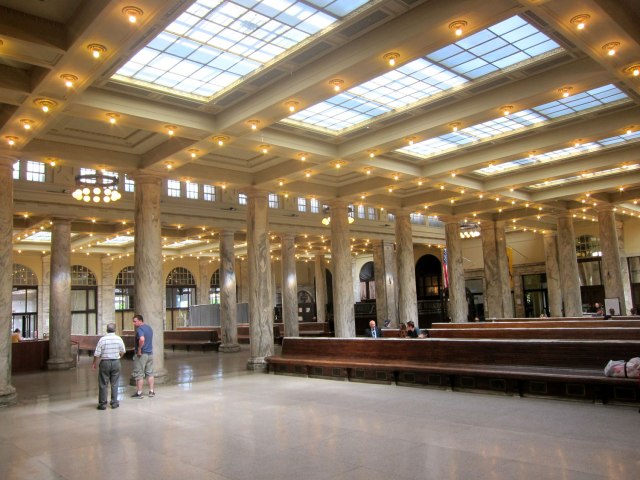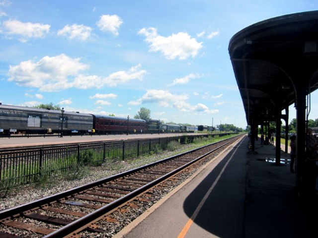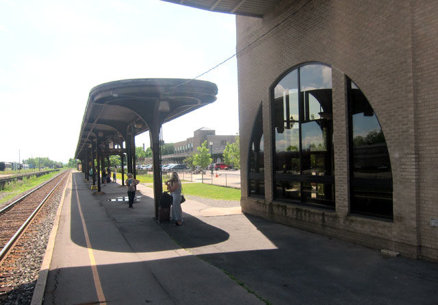 Here is a real gem, and to whet your appetite, here is but one quote from Wikipedia – “Inside is a restaurant and a barber shop, one of the few barber shops in a train station today. The 15,000-square-foot waiting room’s 47-foot-high vaulted ceiling is supported by 34 marble columns. The station’s blueprints called for the importing of columns that originally adorned Grand Central Station in New York City. Eight large benches are heated with steam pipes and vents.” Below is my first stop in Utica on 8 June this year, and almost the same view on this trip, 15 July (but from the station platform, and not car vestibule).