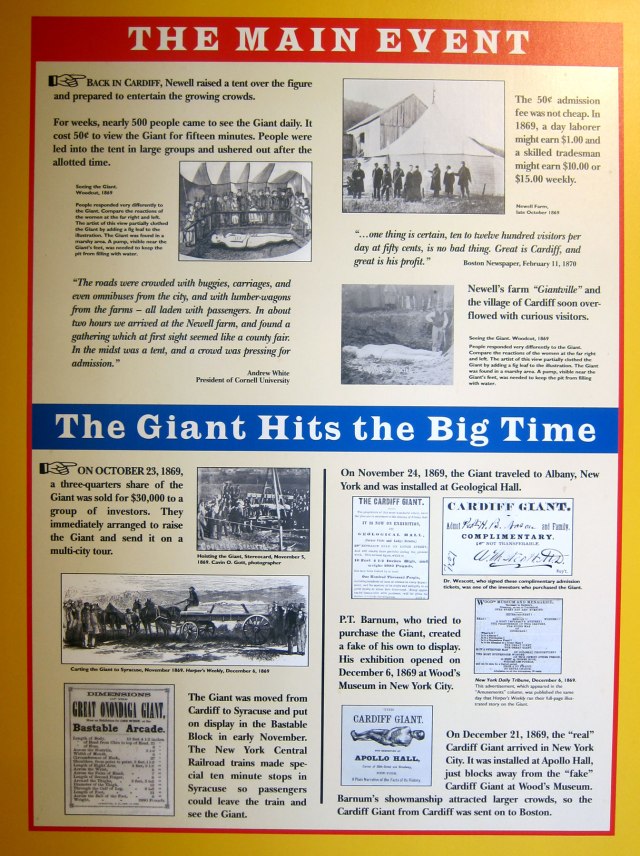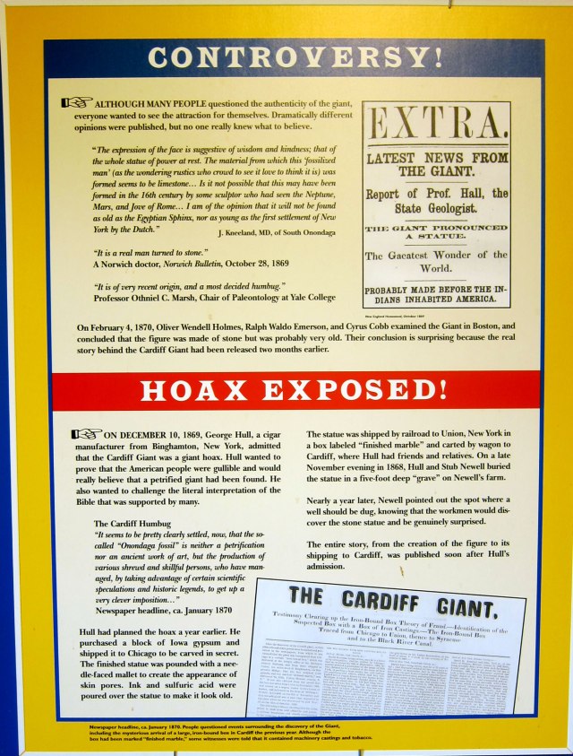 I went into the entrance in the stone barn above (restrooms in the stone silos) to get a map of the farm to make a decision. There was a sign – Cardiff Giant. I could not believe it, was the GIANT really here (historian that I am)? Yes, and the young lady at the counter (unlike the ticket seller at classic The Stanley Theater in Utica) said, “he is just around the corner if you would like to take a look.” Of course !!!