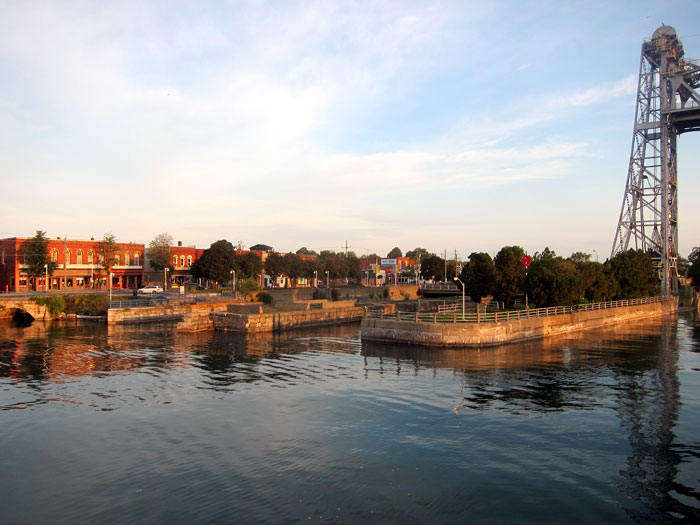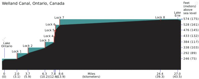 the elevation view below shows you what we did, sailing from right to left, going “down hill.” Note the flight of locks (6, 5, 4) for a quick high descent. Lock 8 is considered a “control lock” for water flow. Lock 7 is the southern most lift on the Niagara Escarpment. Locks 5, 6 and 4 are twin “flight locks.” There is an information center, and observation platform at Lock 3.
