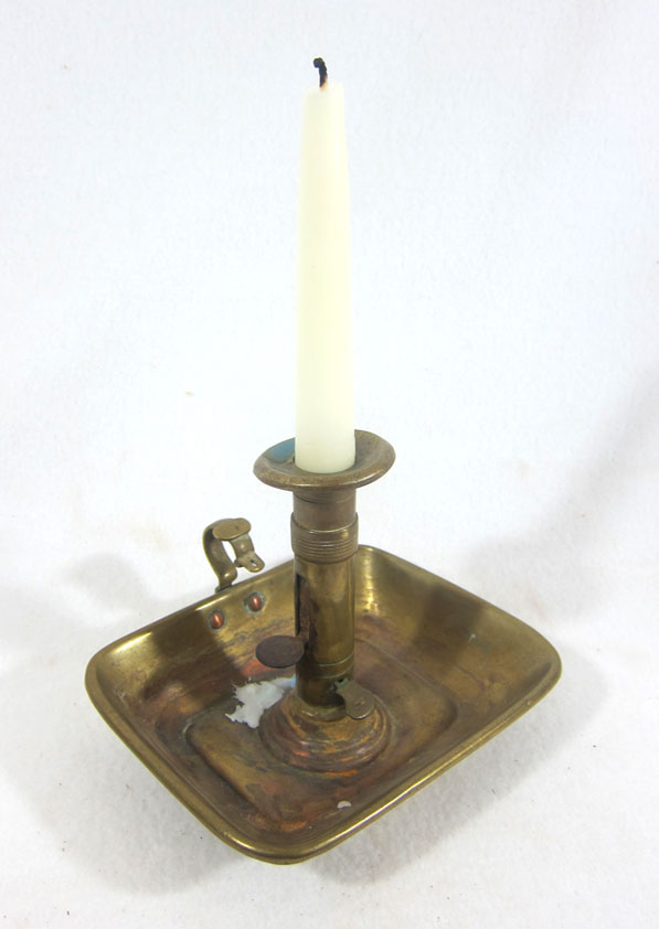 CHAMBERSTICK – First saw one in an 18th century home in Historic Deerfield. Intrigued with the shape, the search was on. The large tray is to catch wax when walking from bed chamber to bed chamber. Lacking on mine is the snuffer which like a dunce cap sits in a slot on the handle. Mine has the requisite “push-up” but there is a second lever that I have not solved. Handsome brass. Found this earlier this year.