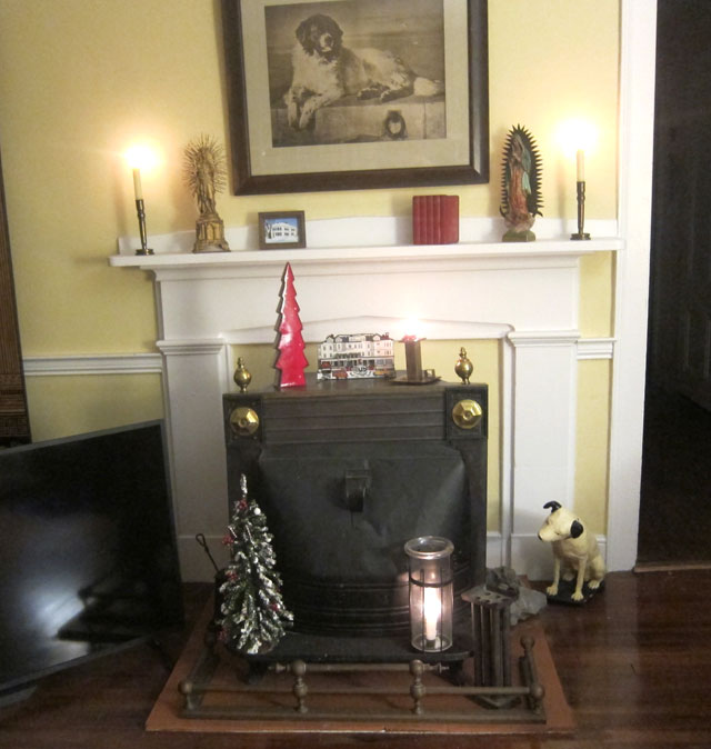 Most everything that surrounds me evokes memories. See the RLI Millennium plates mounted above the mantle, my “book alikes” on the left of the hearth? All spark recollections. And the candles in the “sunburst?” A recent purchase in Manchester, Vermont (2017). A friend and I stopped in a high end consignment shop – nothing under $300 – except this metal holder that was but $17. Not the price, but it “spoke to me” – thus providing a “thing” to prompt the wonderful memories of that excursion and dinner out. Remember, these images are all a tad yellow – hey, after all they are candle light.