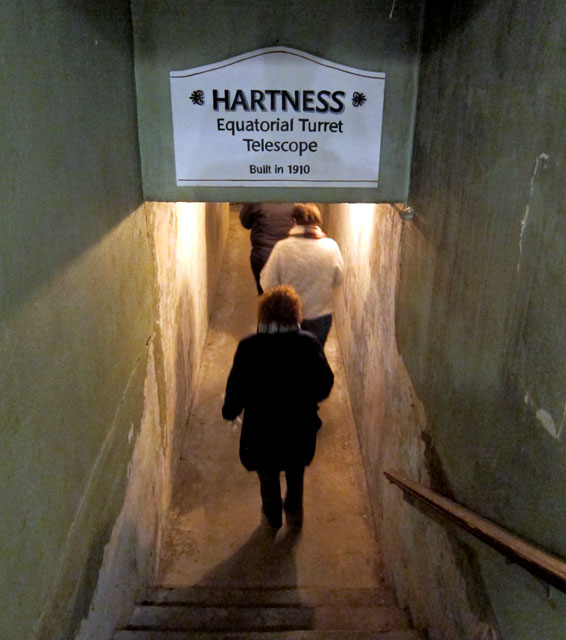 Built in 1904 by James and Lena Hartness, their home hosted many guests including Charles Lindbergh. Hartness was an inventor, managed precision manufacturing in Springfield, and was governor of the State. He experimented with telescopes, and built a large one in the yard, connected underground with a tunnel, and rooms with fascinating telescope exhibits organized by STELLAFANE – a local club for amateur telescope makers. Down we went with our guide.