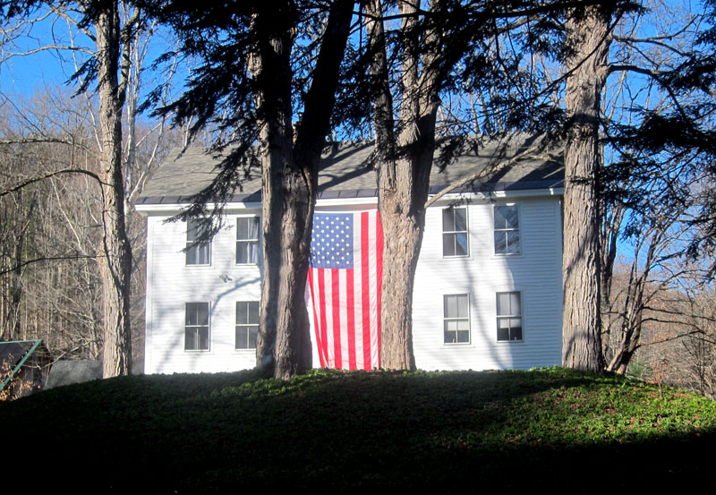Finishing up my visit with Brian at Two Feathers Restoration, I headed west on the Mohawk Trail, and turned north on back roads to intersect with Route 112 at Colrain (more on it later). Entering back into Vermont I saw this colonial home flying true colors on its side (no, not from the trees as Gary asked).