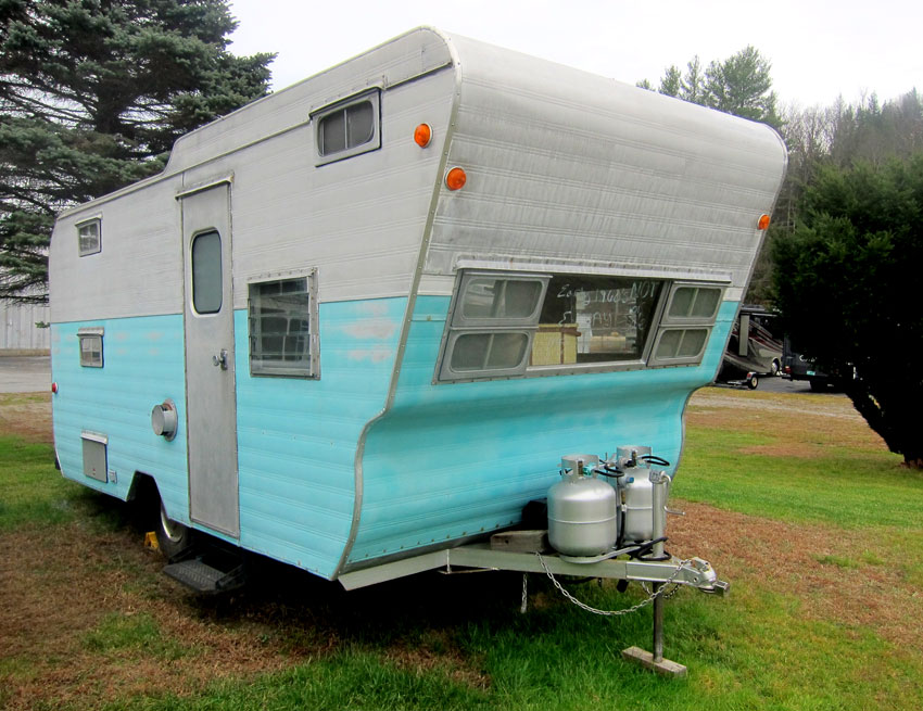 it is a 1966 Eljay, 17 footer, made right in Brattleboro on the property with the Estay Organ factory. This is the very last Eljay trailer made, and was owned until 1976 when it was sold to the previous owner of this RV store on Route 9, where it has been for 54 years. The fellow there was so enthused that I was enthused (I stopped to network to find a “canned ham” – “good luck” he said to me). He got the keys, we headed out, and he showed me through. He restored the interior which has bunk beds and a toilet. The exterior is all original, and sadly it has not been used. Then to (sorry) I-91, and home