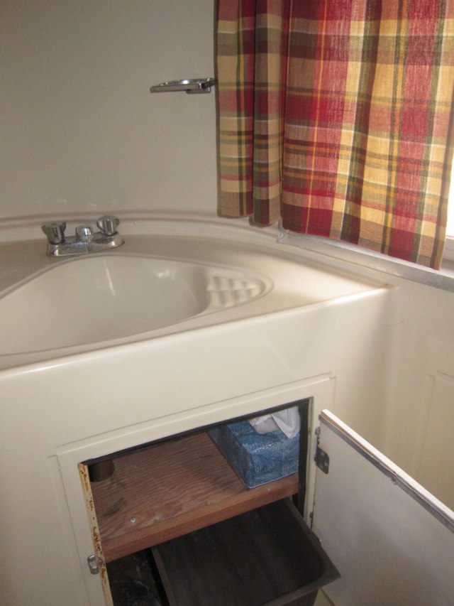 Reading somewhere I learned there were tubs under the couch beds. Figured I would have to find them somewhere for originality. Well, opening up the doors I was pleased to find four of the original tubs remaining. And, on the side there are slide out drawers they rest on.