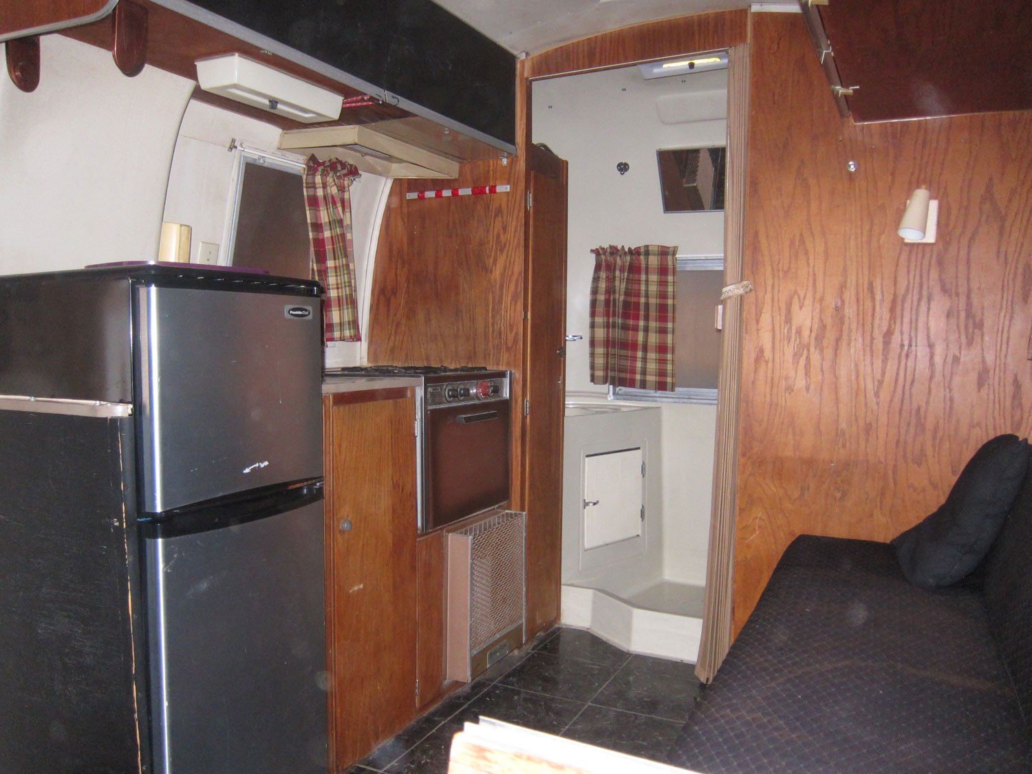This first view is sitting on the front couch, looking back. I had put up one of the tables. The black upholstery and non-original black painted cabinet doors was probably done by Lisa (owner once removed). She told me her “Toaster” was outfitted in a pirate theme for her sons and nephews.