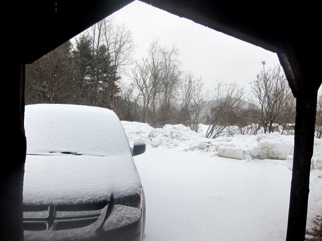 Awaking about 6AM on Friday there had only been a light dusting of snow, but soon it got heavier. Check-out time is 10AM, I planned on reading until then, but with books to ship, decided it wisest to get out of the Dummerston hills sooner. Remember the snow when I left Kipling’s Carriage House in January? Well, now again.