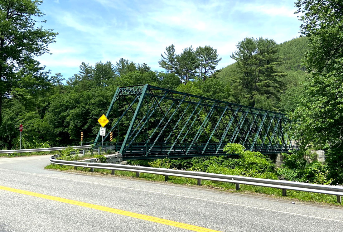 I continued west on East West Road and crossed the West Dummerston Covered Bridge and headed south on Route 30. The bridge now at OSV crossed Stickney Brook just below the old Iron Bridge. I parked, looked north for this image of the Iron Bridge, and then south to the “new” Route 30 bridge across the brook.
