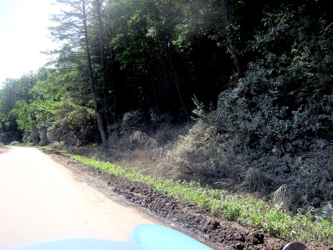 Two dams were built by the Army Corps of Engineers on the West River for flood control. The dam above in 1958-1961, and the Ball Mountain Lake Dam (which you will see later below) built in 1956-1961. The brochures I got on both of these projects have images of the dams filled almost to the top. With the recent rains the road I was on had been underwater, and along side on the bank you can see the silt lines high in the trees along with strewn branches.
