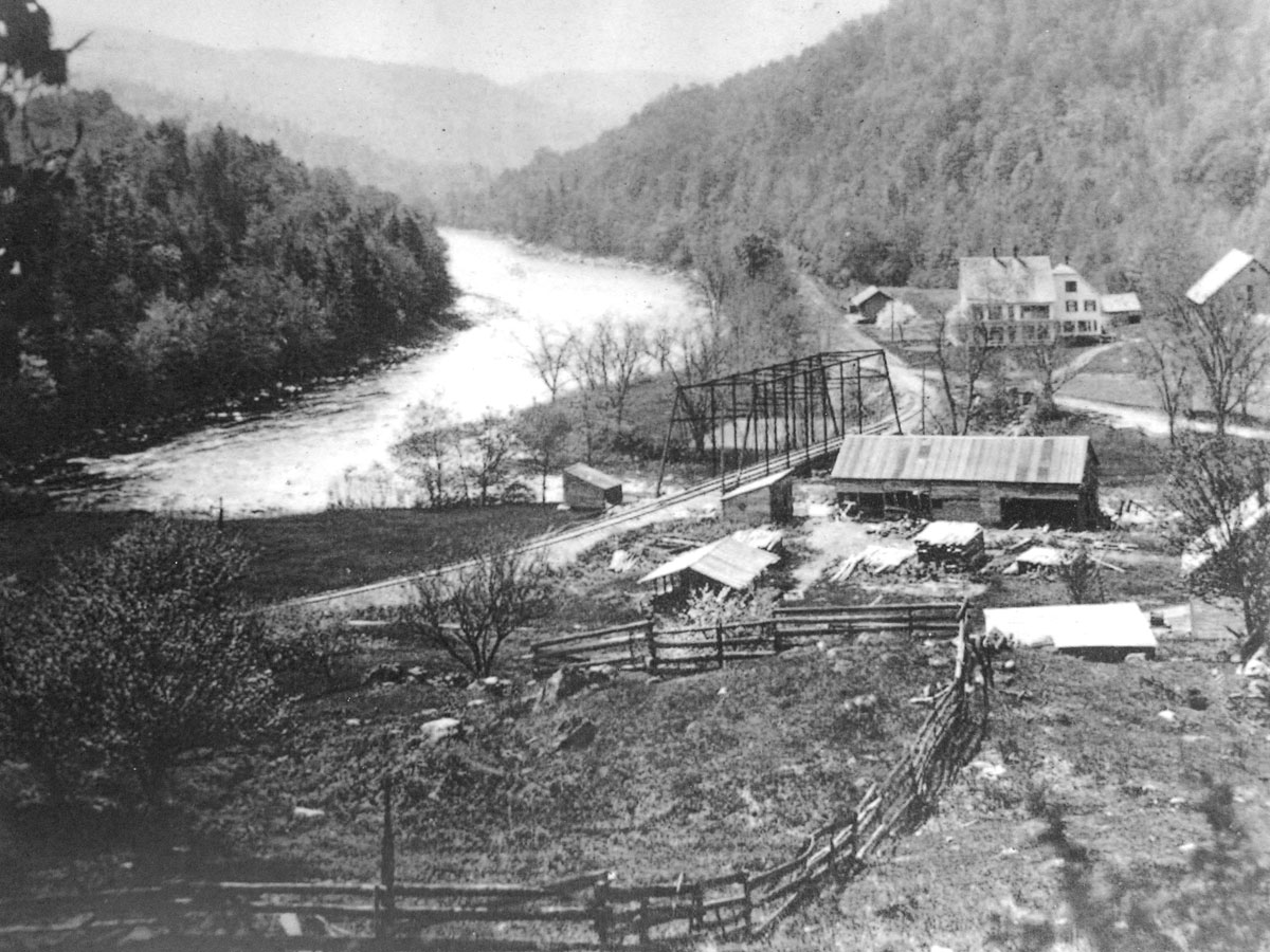 Now this was the greatest stop for me, and again a very helpful couple at the visitor center. I asked if the West River Railroad ran through and where. “Yes it did,” was the reply, “and I have some photos here of what it was like.” He let me copy the three below, and, I was given the map of the campground also. I just had to go down the hill, cross the little bridge over the Winhall River, turn left, and when at the West River turn right. Here is the old photo of that area showing the Winhall River running into the West River.