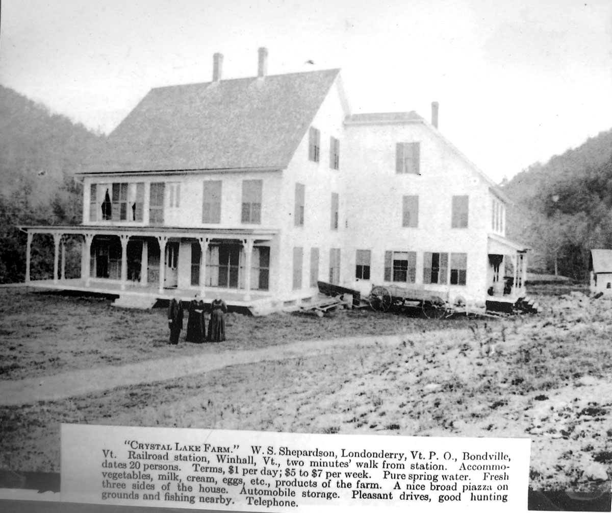 the bridge (no longer there) crosses the Winhall River, and on the rail bed you can see the station just past the large home which served as a hotel. Here is the station, with the hotel in the background.