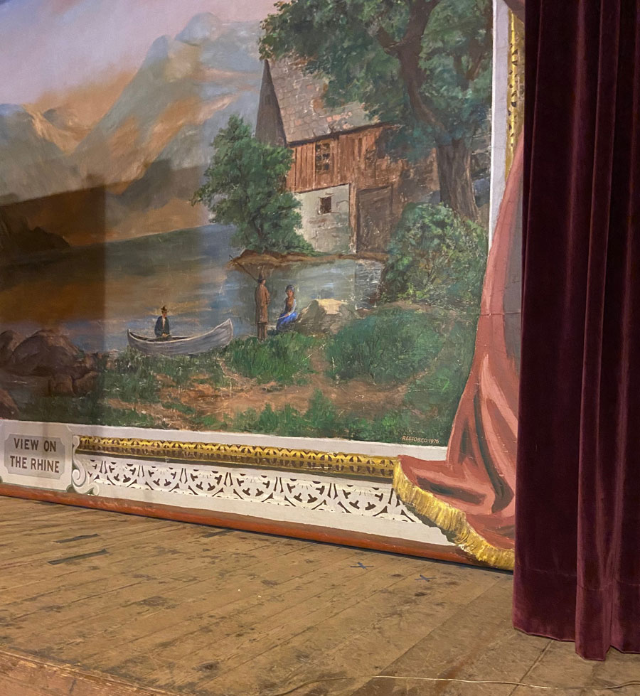 When I walked in Union Hall I was thrilled to experience another hanging painted theater canvas. I first learned of these (and immediately purchased the book – SUSPENDED WORLDS: HISTORIC THEATER SCENERY IN NORTHERN NEW ENGLAND) about six years ago
