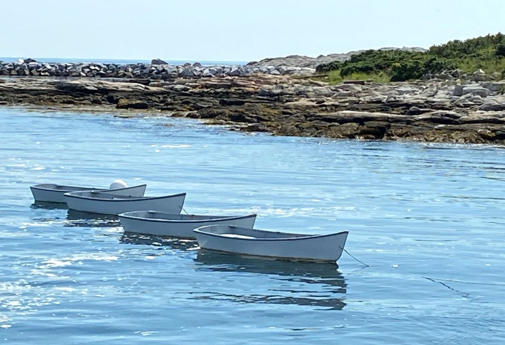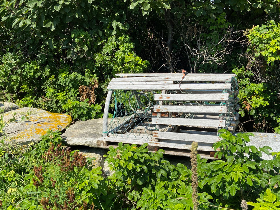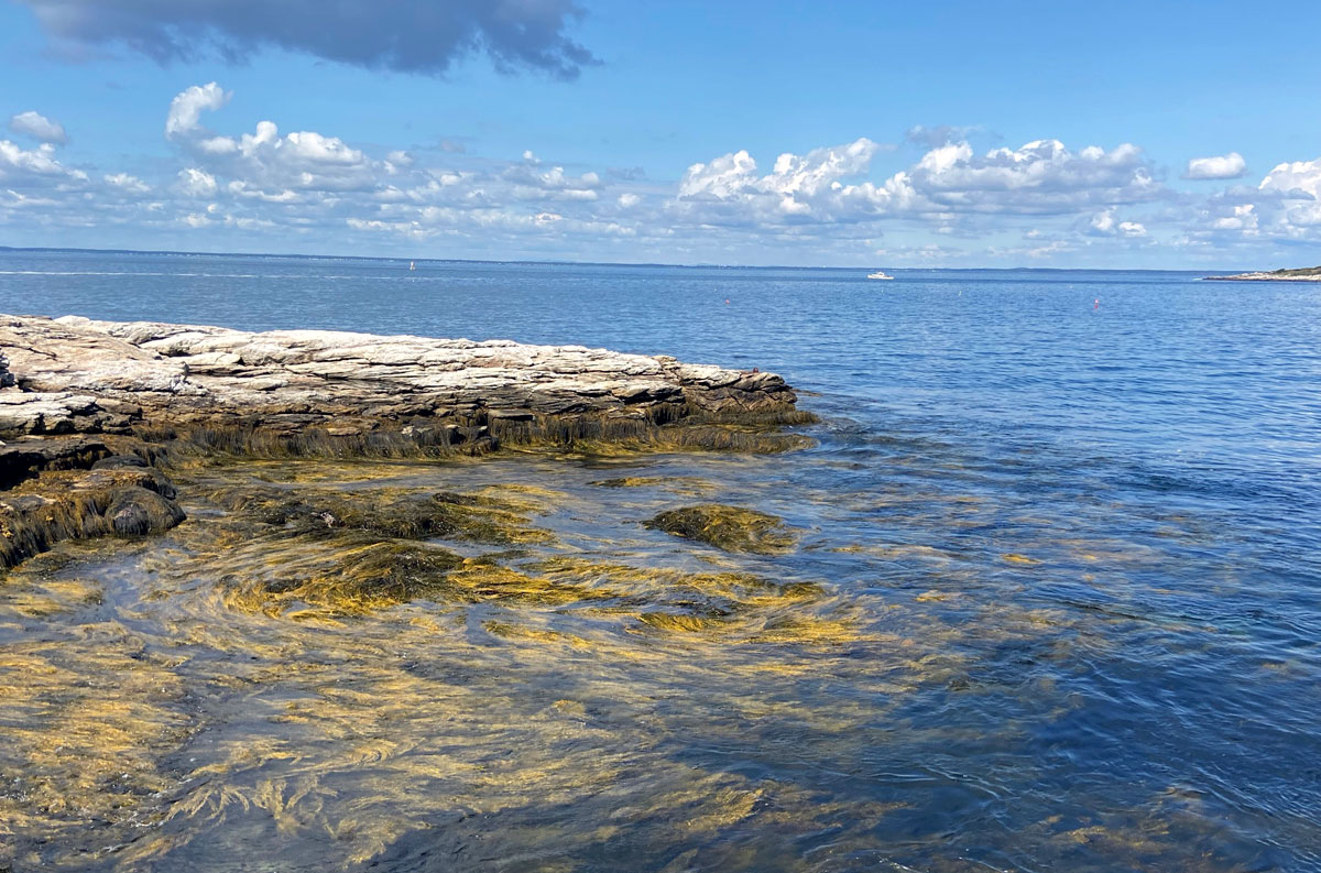 today’s walk I went east on the island. And, being smart with my balance uncertainty I used my traveling collapsable cane. And, I was smart and did not hike all over the rocks as I would have done, lets say a few years ago. This view is looking out over the break wall (that I was on nine years ago) to Cedar Island in Maine.