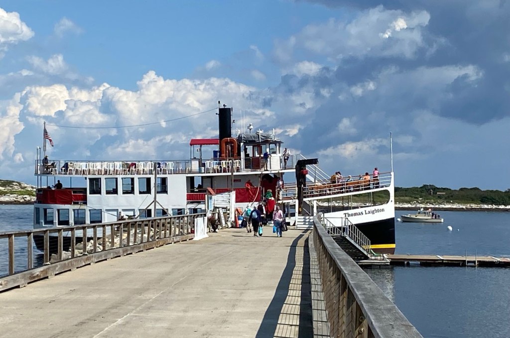 The Isles of Shoals Steamship Company sails from Portsmouth to the island. Besides providing transportation for conferences, you can cruise to the island for a 3.75 hours walking tour. And, if you do that, you will probably plan a stay. You park at the dock, tightly packed in, and board with fellow conferees for the hour plus sail to Star. Leaving the dock we were delayed just a tad as this tanker passed going under the new bridge to Maine (the I-95 bridge is in the distance).